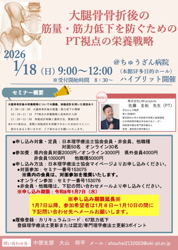 本セミナーでは「大腿骨骨折後の筋量・筋力低下を防ぐためのPT視点の栄養戦略」をテーマに、栄養評価や体組成管理、治療戦略について、臨床で活用できる実践的なアプローチをお伝えします。