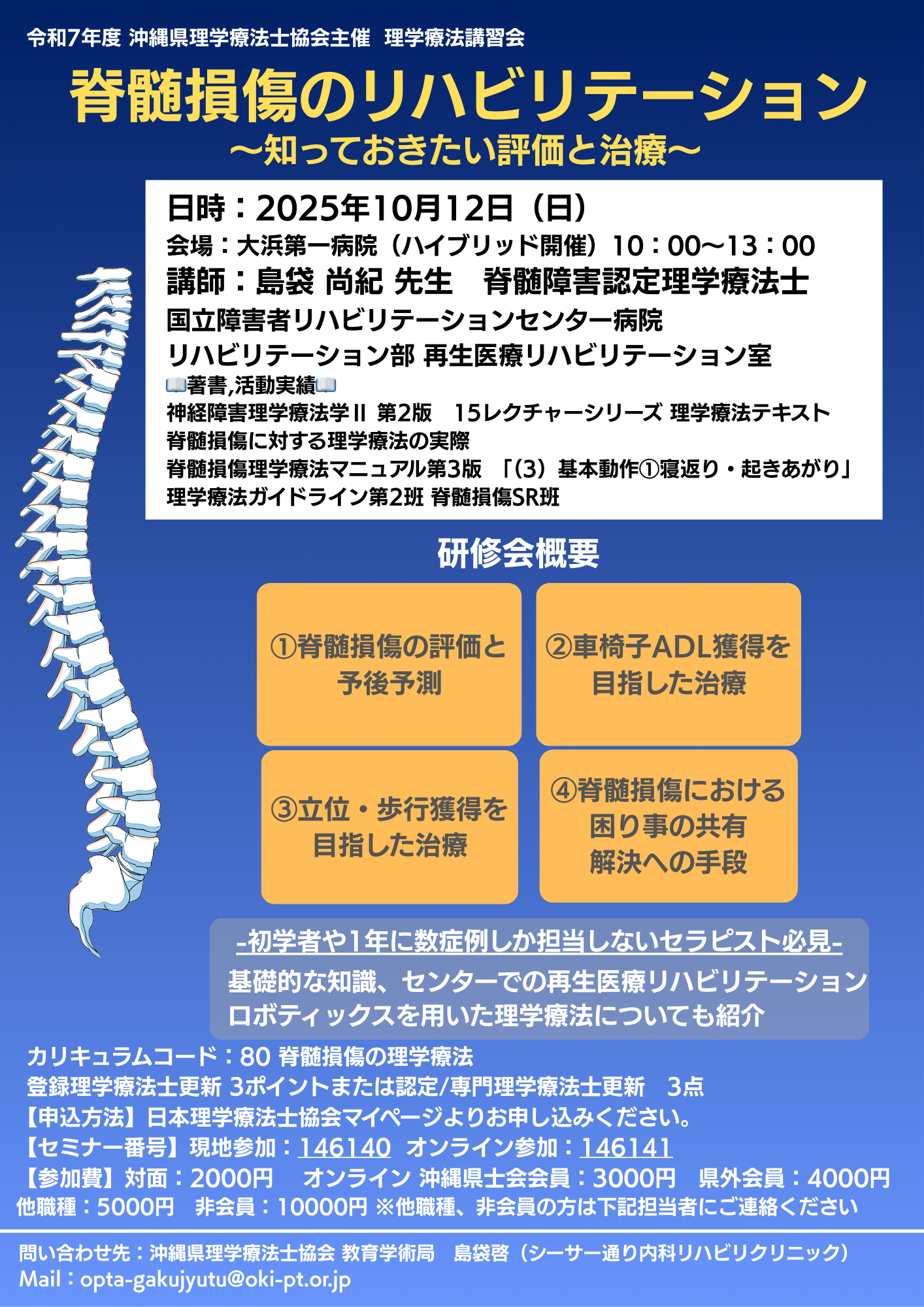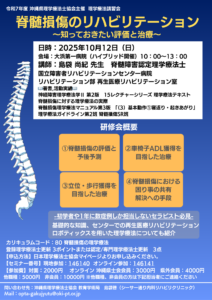 【研修会概要】①脊髄損傷の評価と予後予測 ②車椅子ADL獲得を目指した治療 ③立位・歩行獲得を目指した治療 ④脊髄損傷における困り事の共有・解決への手段