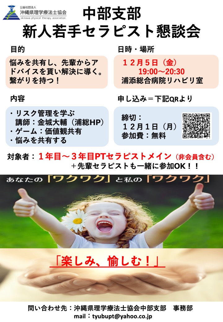 新人から若手のセラピストが集まり、日頃の臨床の悩みや相談事などを共有し、先輩セラピストからアドバイスなど貰いましょう♪