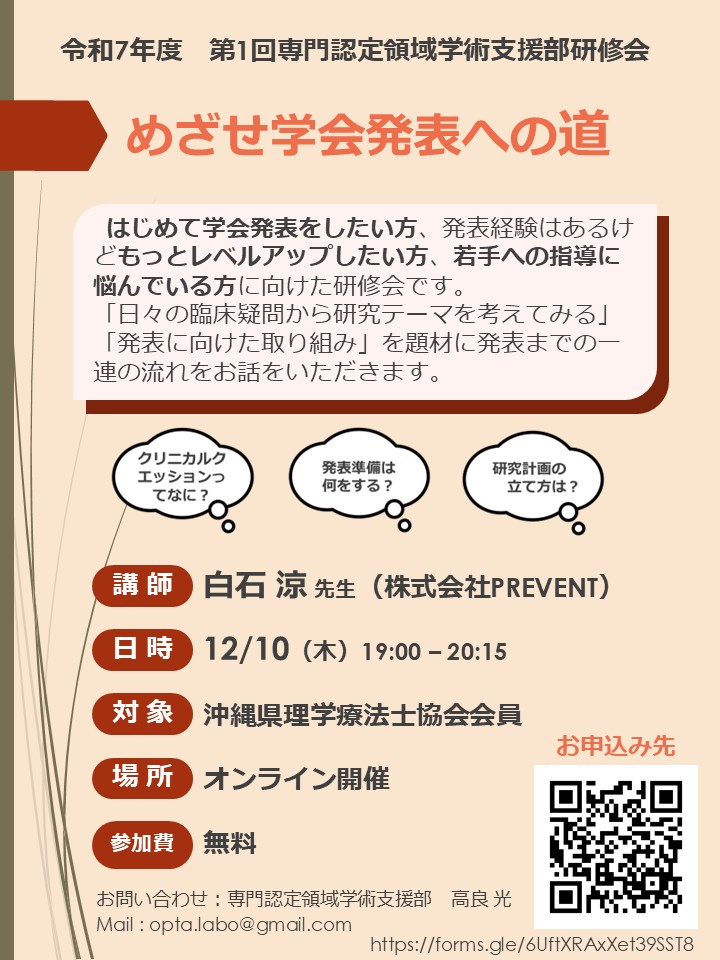 株式会社PREVENTの白石涼先生をお招きし、「めざせ学会発表への道」を開催します。